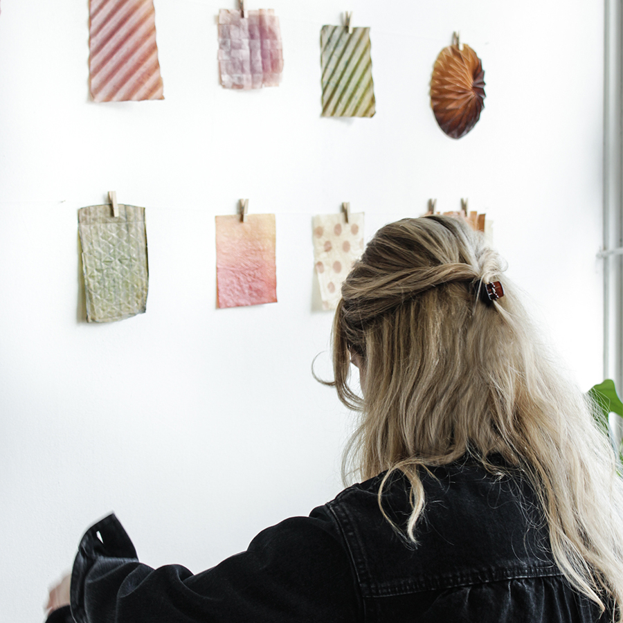 It’s biodegradable, strong, has a high flexibility and can easily be shaped and folded in any desired shape. The grown material is only dyed with sustainable dyes like natural pigments and dyes obtained from fruit and vegetables.